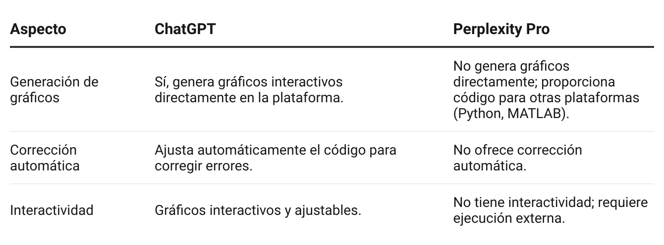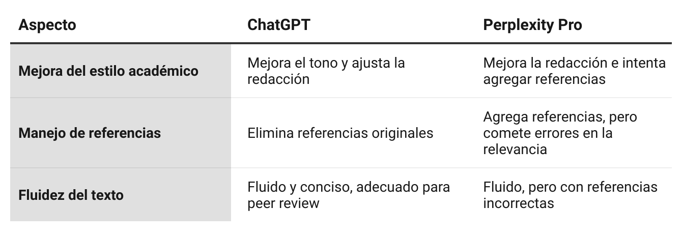 Análisis: Aunque Perplexity Pro puede ser ambicioso en su intento de agregar referencias, ChatGPT es más confiable en cuanto a la fluidez y precisión en la redacción académica.