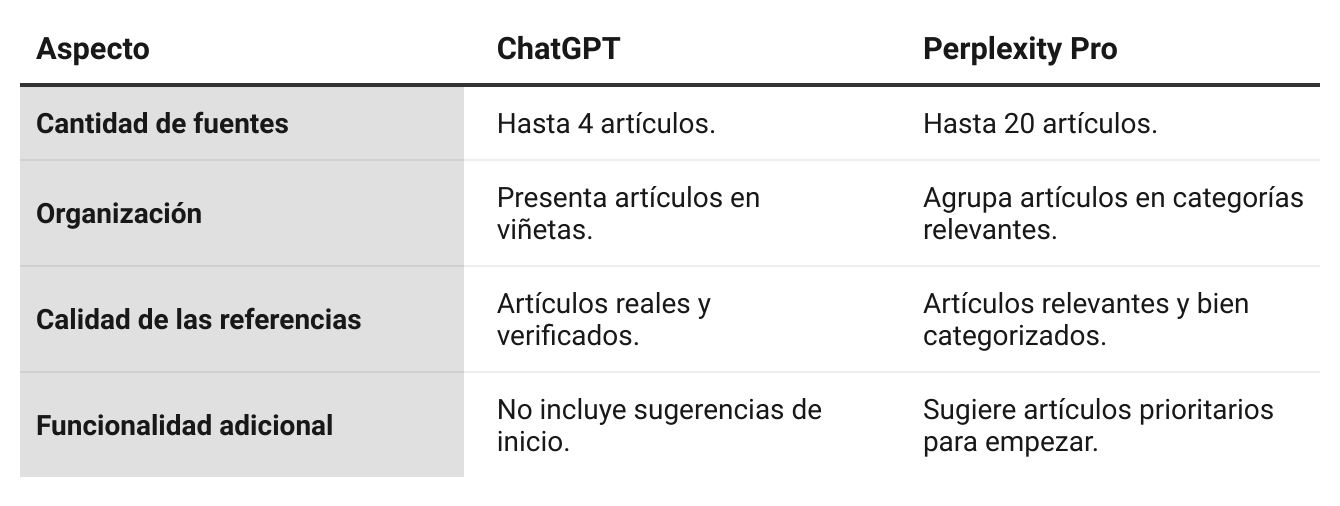 Perplexity Pro sobresale por su capacidad para ofrecer una mayor cantidad de fuentes y organizar la literatura de manera más eficaz, lo que resulta valioso para revisiones sistemáticas o exploraciones iniciales de un campo de estudio.