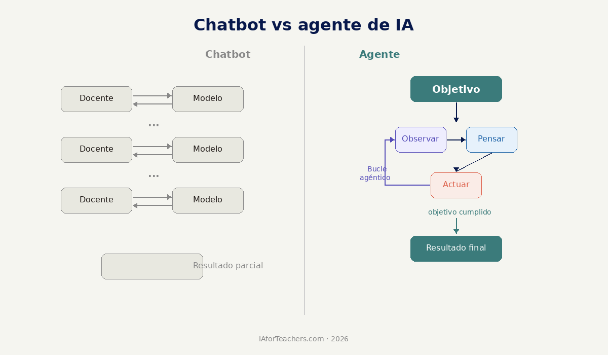 Cuando un docente usa ChatGPT, Claude o Gemini en modo conversacional, la dinámica es lineal. Cada intercambio es un evento aislado donde toda la información relevante debe proporcionarse explícitamente. El modelo no recuerda, no planifica, no verifica. Responde una vez y espera.
