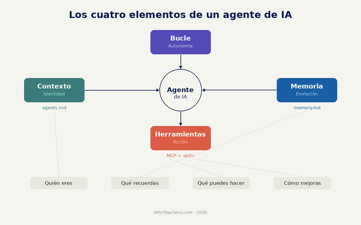 Quizá la idea más relevante para el profesorado sea esta: los agentes no son herramientas que se usan y se dejan. Son sistemas con bucles de retroalimentación que evolucionan con el uso. La diferencia entre un docente que "probó agentes y no le funcionaron" y uno que los tiene integrados en su práctica es, fundamentalmente, la paciencia de construir el sistema: definir el contexto, alimentar la memoria, conectar las herramientas y refinar progresivamente.