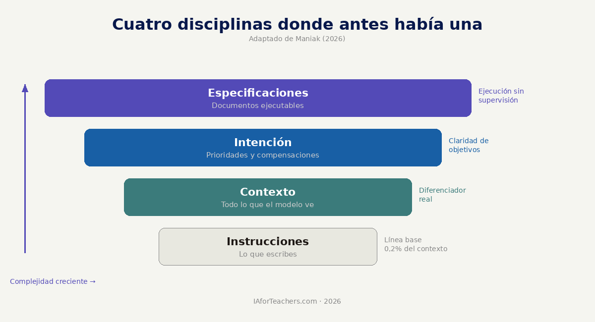 Sebastian Maniak propuso en febrero de 2026 una taxonomía que ilumina bien la amplitud del cambio. Lo que antes llamábamos "ingeniería de instrucciones" escondía en realidad cuatro competencias diferenciadas: