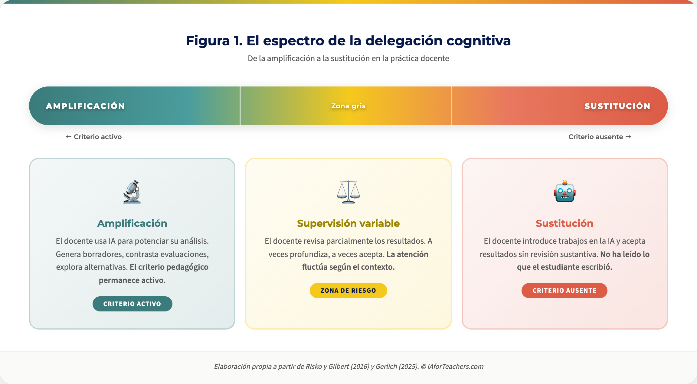 Proponemos pensar la delegación cognitiva como un espectro continuo entre dos polos. En un extremo, la amplificación: el docente utiliza la IA para potenciar su capacidad de análisis, generar borradores que luego revisa críticamente, contrastar su evaluación con la de la máquina o explorar formulaciones alternativas de una retroalimentación compleja. El criterio pedagógico permanece activo en todo momento.