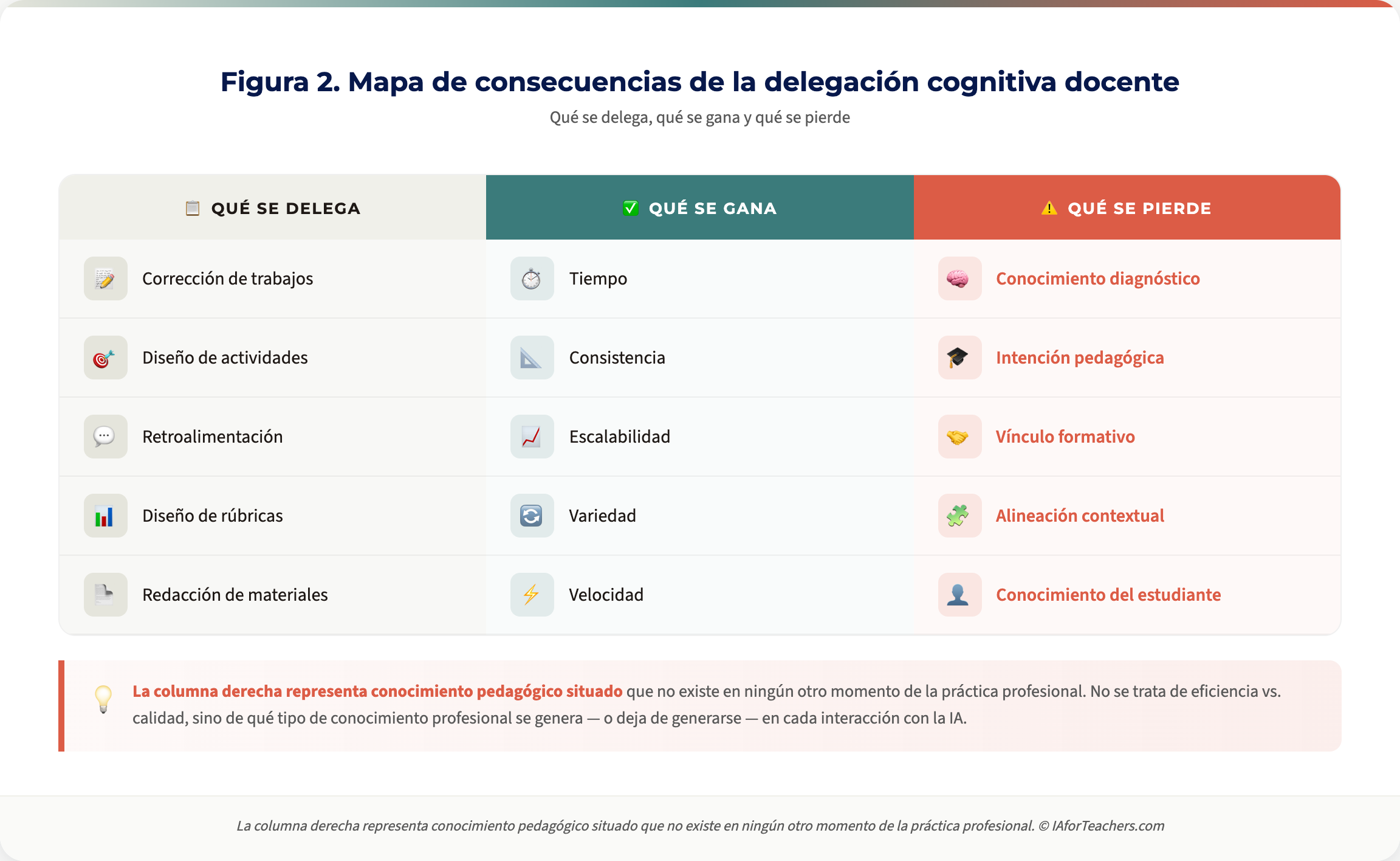 ¿Qué cambia con la IA generativa? La escala y la profundidad de lo que puede delegarse. Ya no descargamos operaciones mecánicas, sino procesos que implican juicio, interpretación y síntesis. Un modelo de lenguaje puede generar retroalimentación personalizada, diseñar rúbricas, redactar objetivos de aprendizaje o evaluar la coherencia argumentativa de un ensayo. Todas estas son tareas que, cuando el docente las realiza, activan un conocimiento pedagógico situado que no existe en ningún otro momento de la práctica profesional.