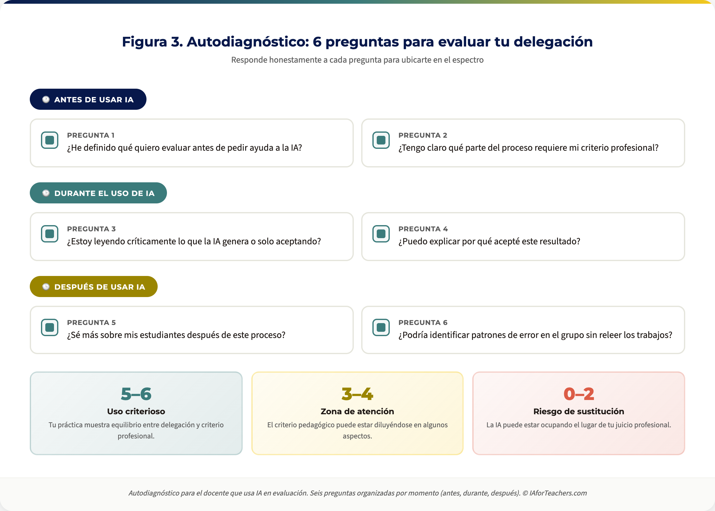 Cuando el docente delega la corrección a la IA sin leer las entregas, pierde el diagnóstico. Cuando delega el diseño de actividades, pierde la intención pedagógica que conecta la actividad con los objetivos de aprendizaje. Cuando delega la retroalimentación, pierde el vínculo formativo con el estudiante, ese momento en que la evaluación deja de ser un trámite y se convierte en una conversación sobre el aprendizaje.