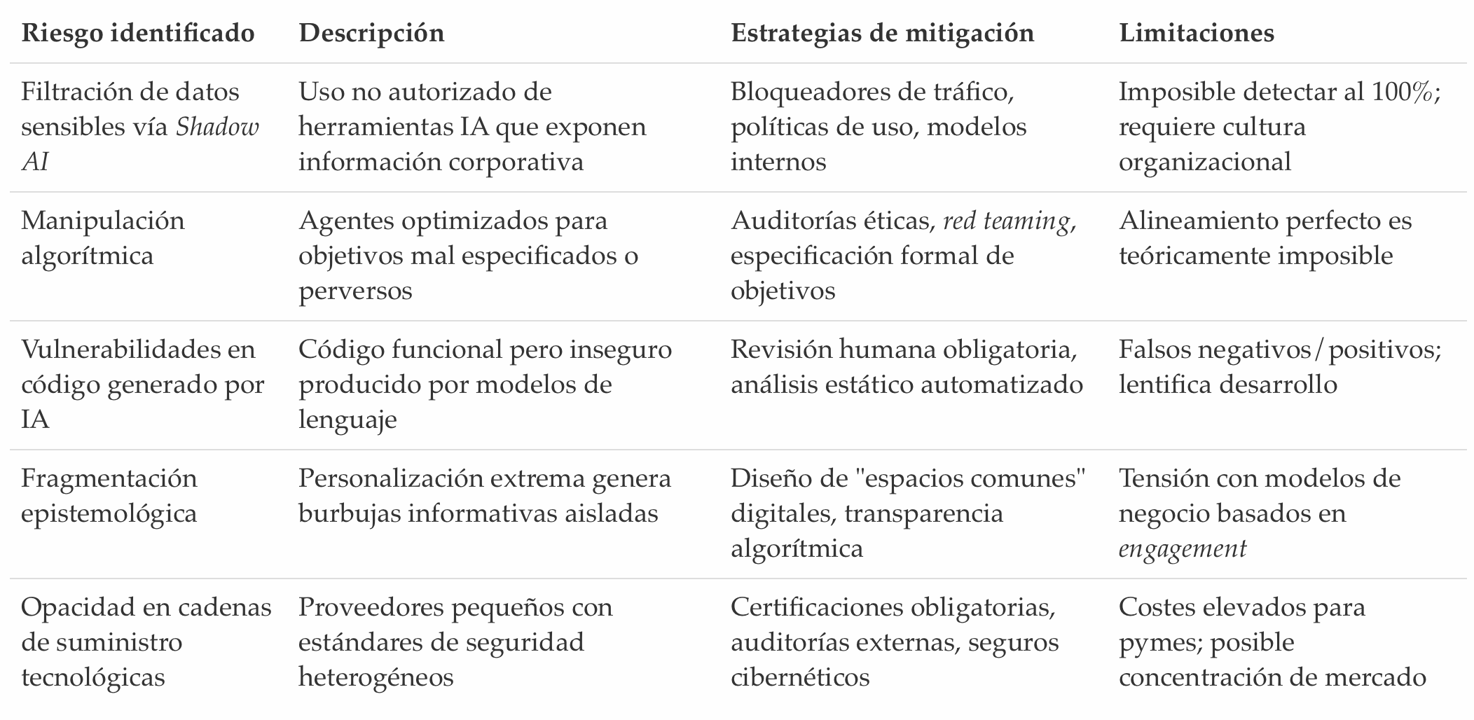 Morkunas reconoce que existen soluciones técnicas: bloqueadores de tráfico a endpoints no autorizados, alojamiento interno de modelos (on-premise deployment), herramientas de rastreo de uso y encriptación de datos sensibles. Sin embargo, admite con franqueza que “la seguridad al 100% es imposible” (citado en Limón, 2025). La afirmación no es derrotista; es realista. En sistemas suficientemente complejos, los vectores de ataque se multiplican exponencialmente y la superficie de exposición crece de manera no lineal.