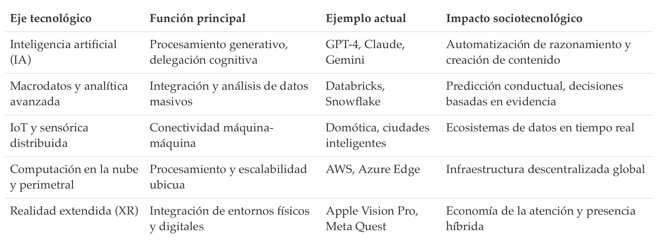 Nota a la tabla: Esta tríada describe la arquitectura de una nueva civilización digital, donde la cognición se descentraliza y el conocimiento se distribuye entre redes, sensores y modelos de IA. Elaboración propia.
