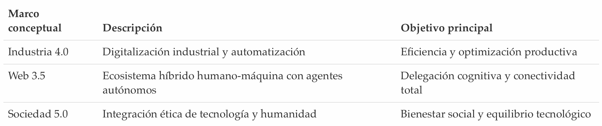 Desde una perspectiva sistémica, la Web 3.5 puede entenderse como una plataforma de convergencia sociotecnológica en la que las innovaciones de la Industria 4.0 (automatización, IoT, IA, computación en la nube) confluyen con las aspiraciones de la Sociedad 5.0 —concepto acuñado por la Federación Empresarial Japonesa Keidanren (2017)— que propone la integración ética de tecnología y humanidad orientada hacia el bienestar social y el equilibrio tecnológico.
